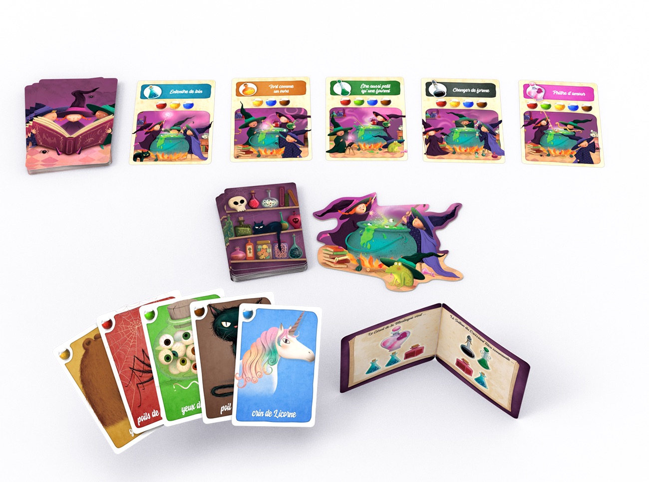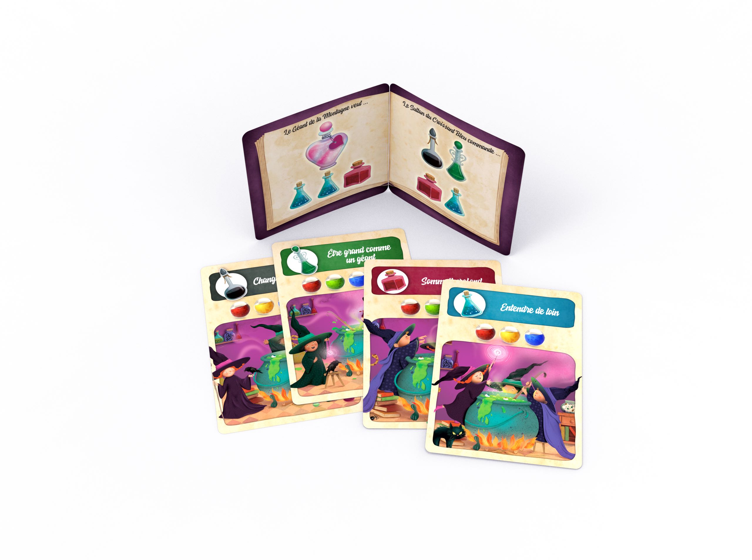 Chaque joueur choisit un manuel de sorcellerie qui lui donne le choix entre 2 «contrats» à remplir. Il faudra obtenir toutes les potions de l’une ou l’autre page.