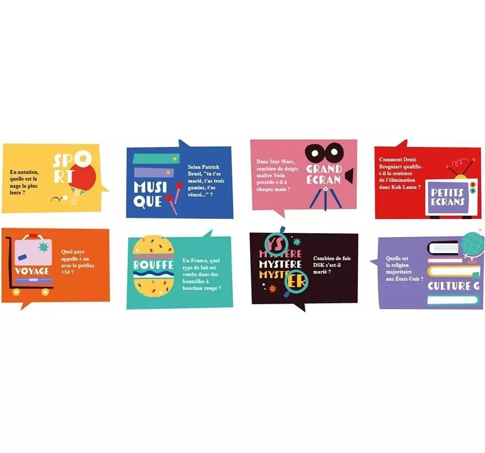 Le jeu propose 8 catégories de question pour que tout le monde s’y retrouve :