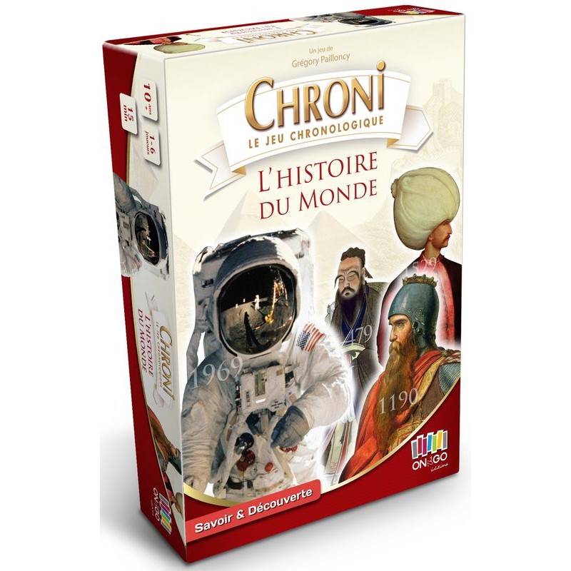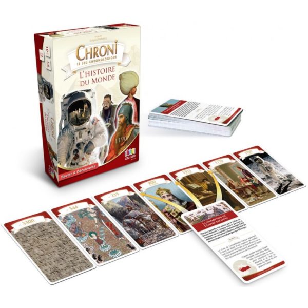 Chaque carte donne une petite explication et des anecdotes sur l’évènement. En jeu collectif chaque joueur à son tour insère une de ses cartes, côté texte, dans la suite de cartes posées sur la table, à sa place chronologique. Il retourne ensuite la carte côté date pour vérifier si la place est la bonne. Cette boîte offre un voyage dans le temps pour découvrir ou redécouvrir 60 dates clés de l’histoire de l’humanité et c’est très agréable d’y jouer à tout âge ! On peut faire des parties en mélangeant plusieurs jeux de Chroni !
