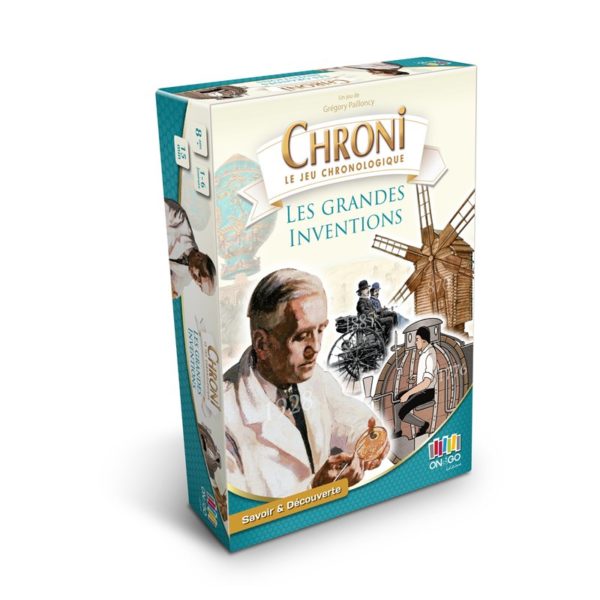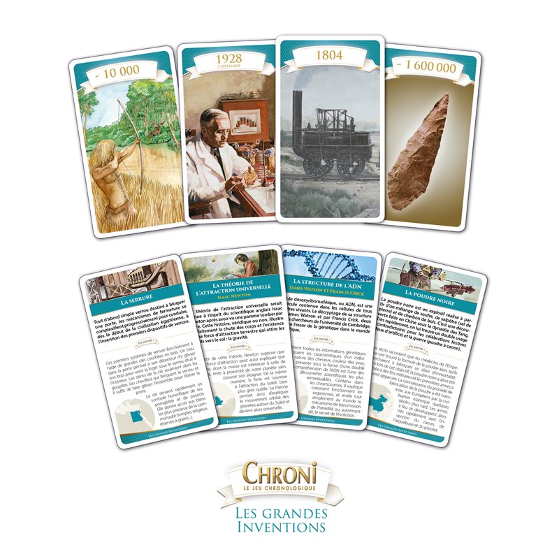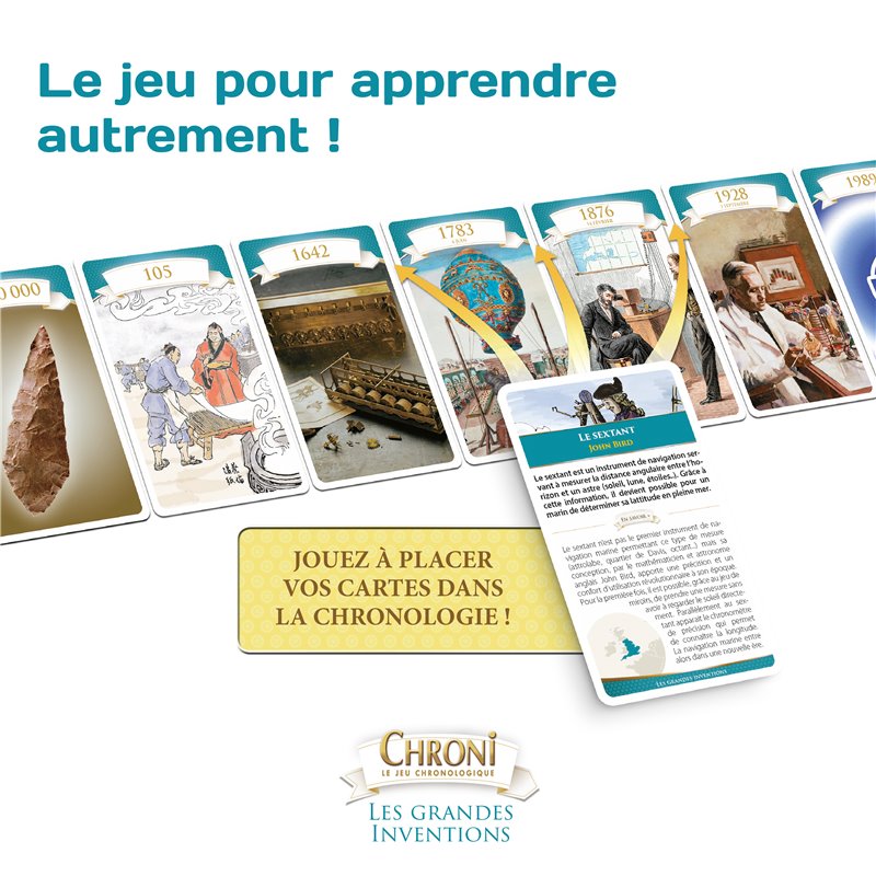 Mémoriser les grandes dates de l’histoire en jouant aux cartes ! On peut utiliser le jeu seul: on prend une carte côté date et on devine de quel évènement il s’agit, ou l’inverse. Chaque carte donne une petite explication et des anecdotes sur l’évènement. En jeu collectif chaque joueur à son tour va insérer une de ses cartes, côté texte, dans la suite de cartes posées sur la table, à sa place chronologique. Il retourne ensuite la carte côté date pour vérifier si la place est la bonne. Cette boîte reprend les grandes inventions et découvertes scientifiques de la préhistoire au vingtième siècle et c’est très agréable d’y jouer à tout âge!