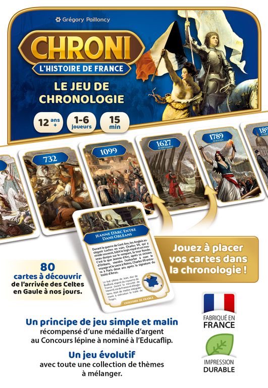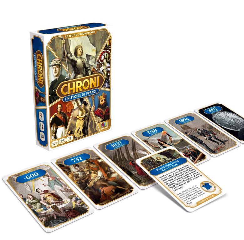 Chroni – L’Histoire de France… Le jeu pour apprendre autrement ! Jouez à placer vos cartes dans la frise chronologique, et apprendre autrement. Le premier joueur à ne plus avoir de cartes en main remporte la partie. Mais attention si on se trompe.. on pioche. Instructif, évolutif, simple et malin. Récompensé au concours Lépine.
