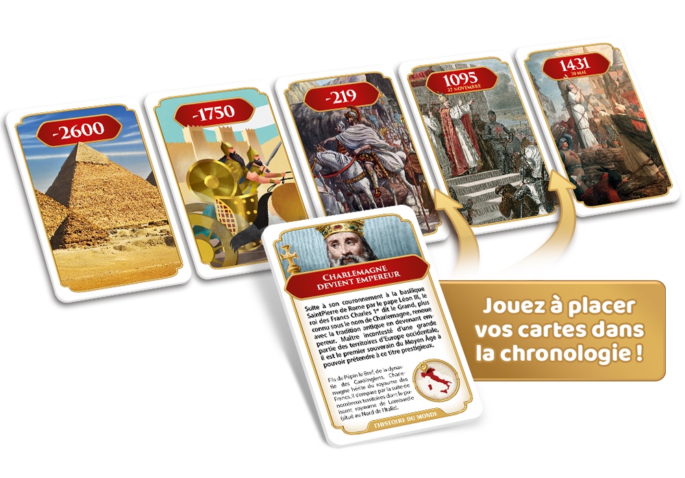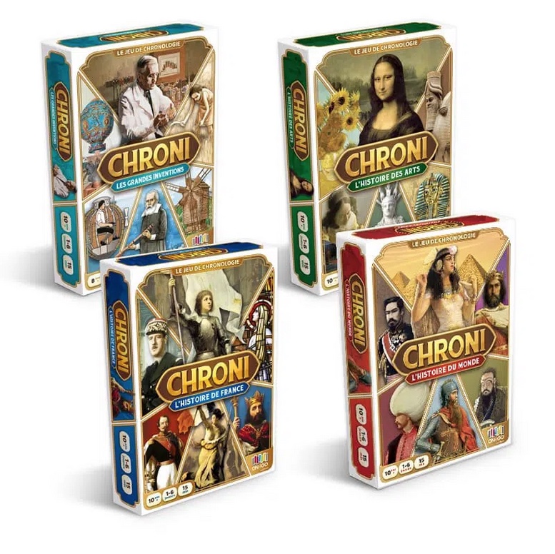 Chacun son tour, un joueur tente de situer une de ses cartes dans la frise chronologique. Le premier à ne plus avoir de carte dans sa main remporte la partie. Mais attention si on se trompe, on pioche. De la connaissance, de la déduction mais aussi un peu de chance permettent de gagner. Mais la mécanique est basée sur l’apprentissage par l’erreur. « Je ne perds jamais. Soit je gagne, soit j’apprends » disait Nelson Mandela Chroni est un jeu instructif et évolutif avec toute une collection de thèmes à mélanger.