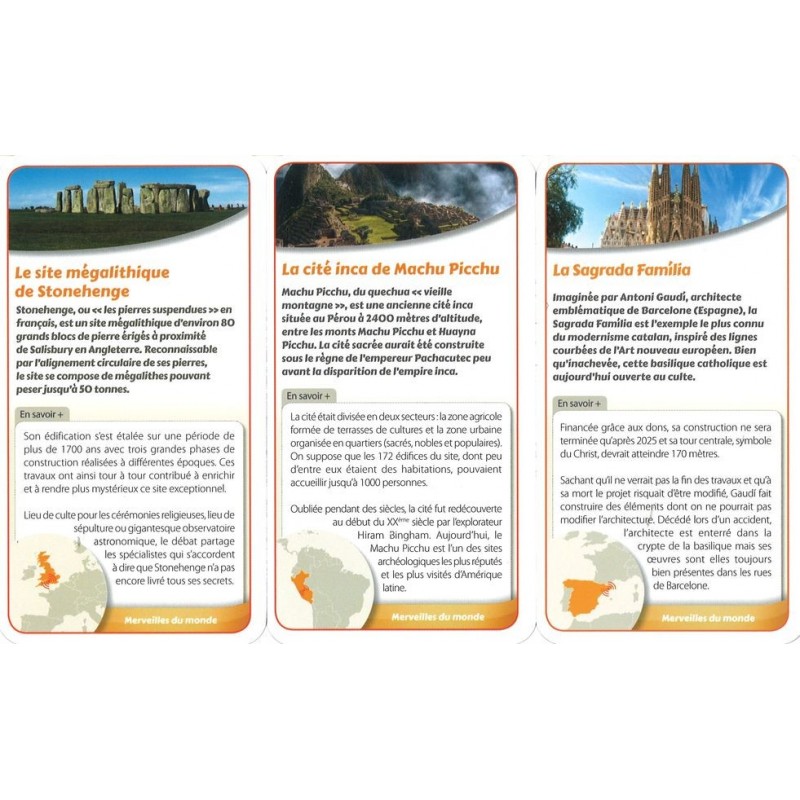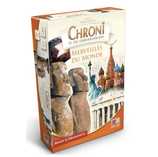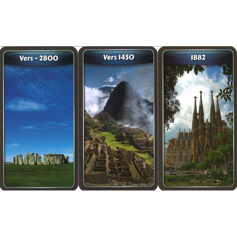 En jeu collectif chaque joueur à son tour va insérer une de ses cartes, côté texte, dans la suite de cartes posées sur la table, à sa place chronologique. Il retourne ensuite la carte côté date pour vérifier si la place est la bonne. Cette boîte offre un voyage dans le temps pour découvrir ou redécouvrir 60 monuments et sites célèbres à travers la planète et c’est très agréable d’y jouer à tout âge!