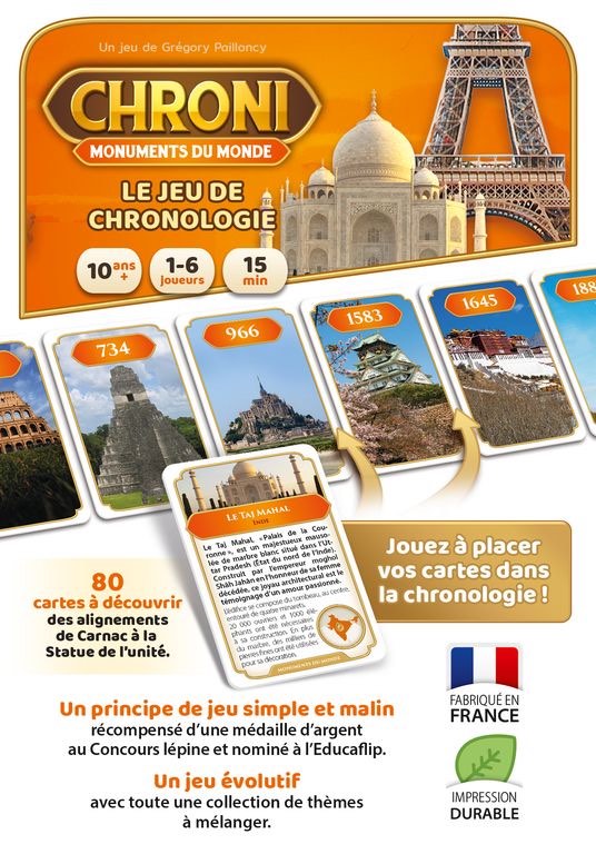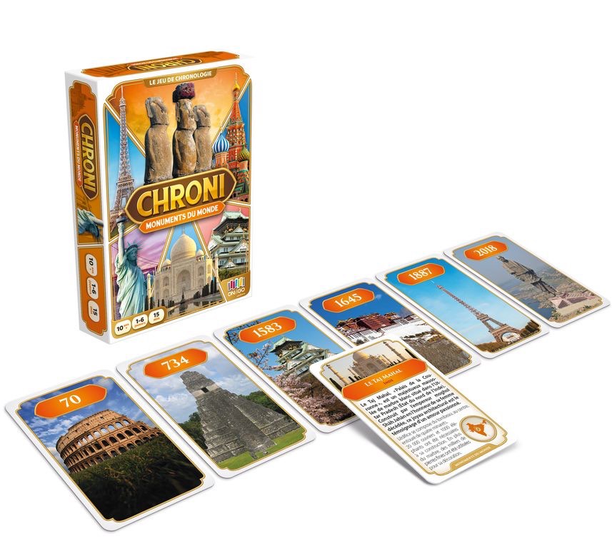 Chroni – Monuments du Monde… Le jeu pour apprendre autrement ! Jouez à placer vos cartes dans la frise chronologique, et apprendre autrement. Le premier joueur à ne plus avoir de cartes en main remporte la partie. Mais attention si on se trompe.. on pioche. Instructif, évolutif, simple et malin. Récompensé au concours Lépine.