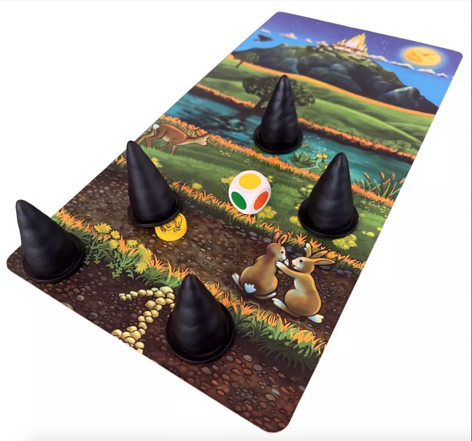 Cinq Petites Sorcières… Un grand classique pour les tout-petits, simple, poétique et plein de malice. Les joueurs doivent retrouver quelle sorcière colorée se cache sous quel chapeau et les aider à rejoindre la montagne où leurs mamans les attendent. Un jeu de mémoire et de chance, magnifiquement réédité en boîte magnétique, parfait dès 3 ans pour initier aux premiers jeux de société.