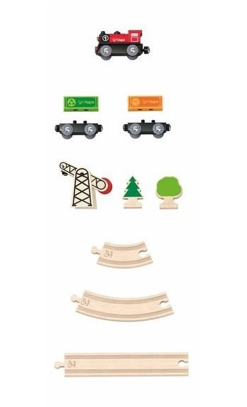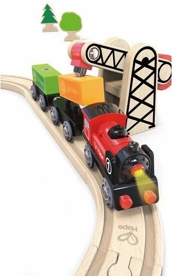 Votre enfant mettra sa locomotive en marche et la regardera transporter joyeusement ses wagons sur le circuit. Lorsque le train termine un tour, la grue magnétique rentre en action afin de charger et de décharger les marchandises. Compatible avec la plupart des circuits de train en bois.
