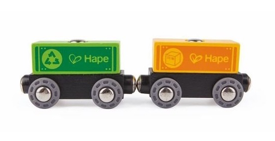Découvrez le circuit du train de marchandises de Hape, un premier circuit de train à piles avec une grue magnétique pour charger et décharger les wagons.