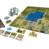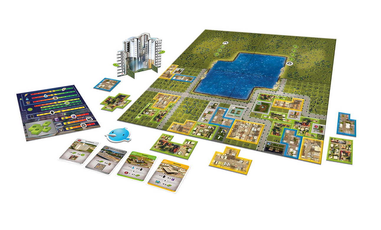 Matériel : 6 plateaux de jeu, 1 plateau Administration, 48 tuiles Zone, 37 tuiles Bâtiment, 120 cartes, 26 jetons Argent, 8 marqueurs Administration, 1 jeton Premier joueur, 1 panneau Skyline, 2 marqueurs Bonheur et 1 livret de règles.