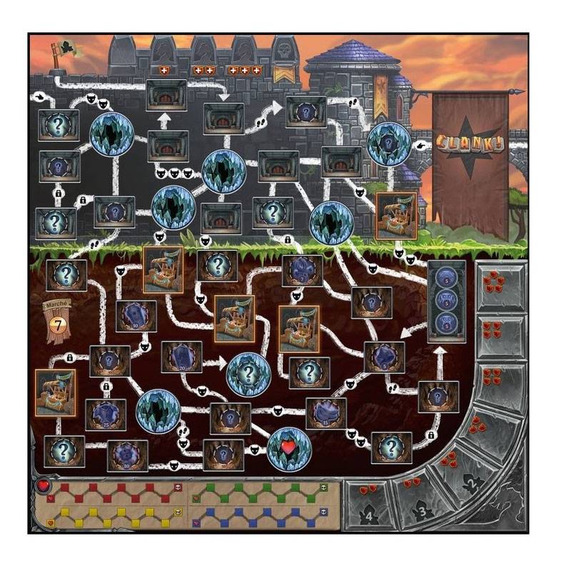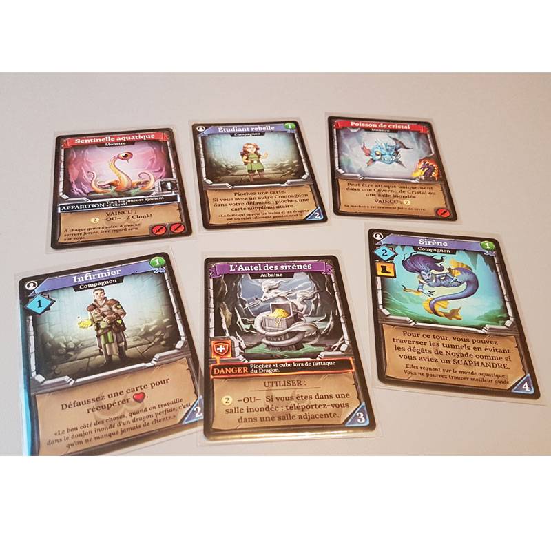 Dans Clank! Trésors Engloutis, une extension pour Clank!, les joueurs explorent deux cartes de donjons partiellement submergés, avec un nouveau deck de cartes donjon, un nouveau monstre persistant et de nouveaux challenges environnementaux !