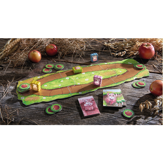 1 plateau de jeu à assembler (3 pièces), 4 cochons en bois, 6 cartes course, 16 tuiles pomme, 1 règle du jeu.