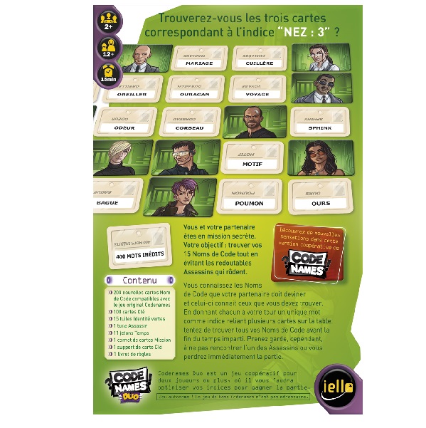 Codenames Duo est un jeu coopératif pour 2 joueurs (ou plus) dans lequel vous devez retrouver tous vos Noms de Code avant la fin du temps imparti. Pour cela, vous devez, tour à tour, deviner ou faire deviner vos Noms de Code en donnant le meilleur indice possible. Prenez garde à ne pas tomber sur les redoutables Assassins qui rôdent !