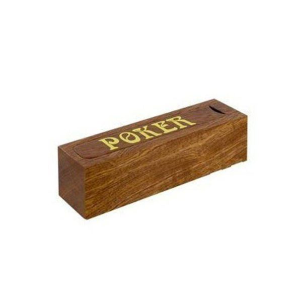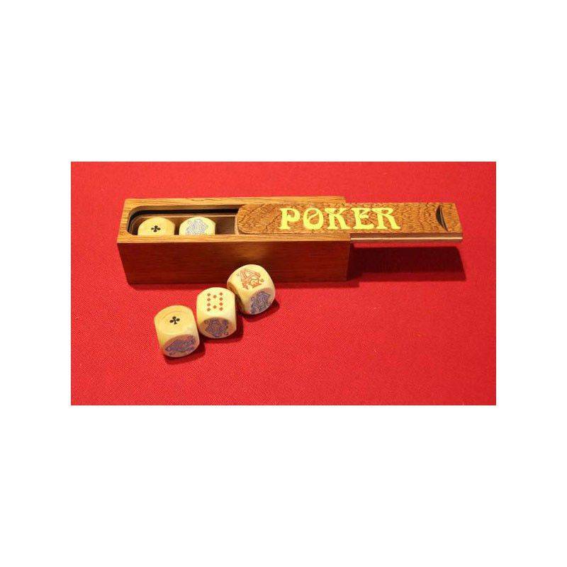 Les 5 Dés Poker en Buis de 18 mm, ainsi que leur boîte de rangement. Esthétique et Caligraphie des dès raffinée.
