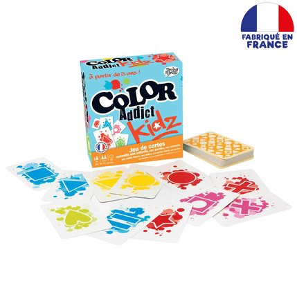 Fun et concentration au rendez-vous ! Le jeu de rapidité dont le but est de se débarrasser le plus vite possible de ses cartes, adapté pour les joueurs les plus jeunes : Dans le même esprit que le célèbre Color Addict, ce jeu se base sur les couleurs et sur les formes. Idéal pour les enfants qui ne savent pas encore lire ! (les lettres sont remplacées par des symboles).