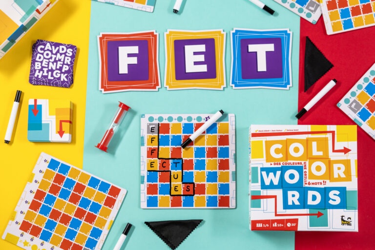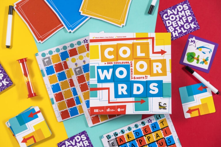Color Words… Des couleurs, une grille, 6 mots !! Écrire un mot à chaque tour en utilisant les lettres imposées, ça peut paraître facile… Mais saurez-vous placer ces lettres sur les cases de la bonne couleur et respecter le bonus pour composer la meilleure grille de 6 mots et l’emporter sur vos adversaires ?