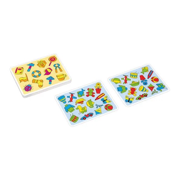 Prenez deux cartes pleines d’objets rigolos et colorés et observez-les. Le premier joueur à découvrir l’objet identique en forme et en couleur commun aux deux cartes bleues gagne le point. Attention, sur les cartes jaunes, le jeu se corse et il faudra retrouver les 2 objets communs !