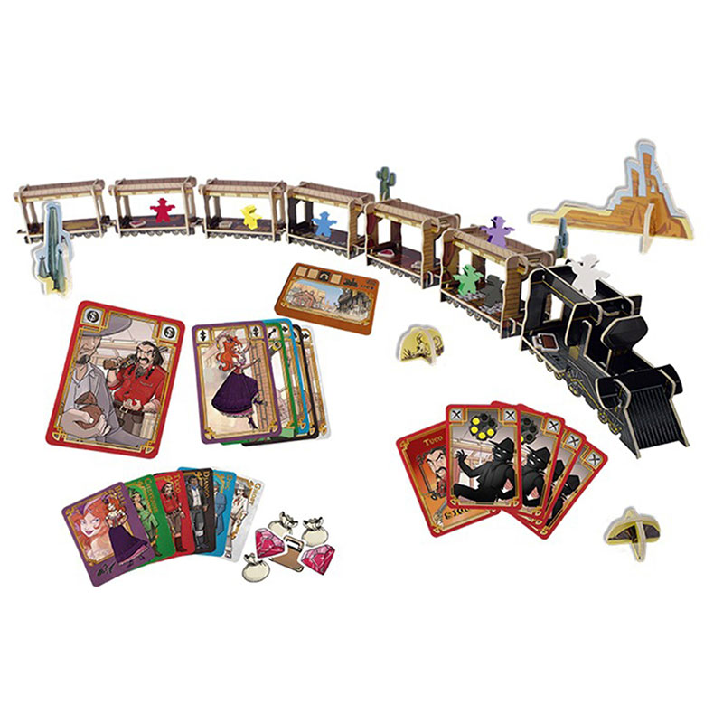 Contenu : 132 cartes (63.5x89mm Standard), 1 locomotive et 6 wagons à monter, 10 éléments de décor, 26 marqueurs, 6 pions Bandit, 1 pion Marshall, 6 fiches personnages, 1 livret de règles.