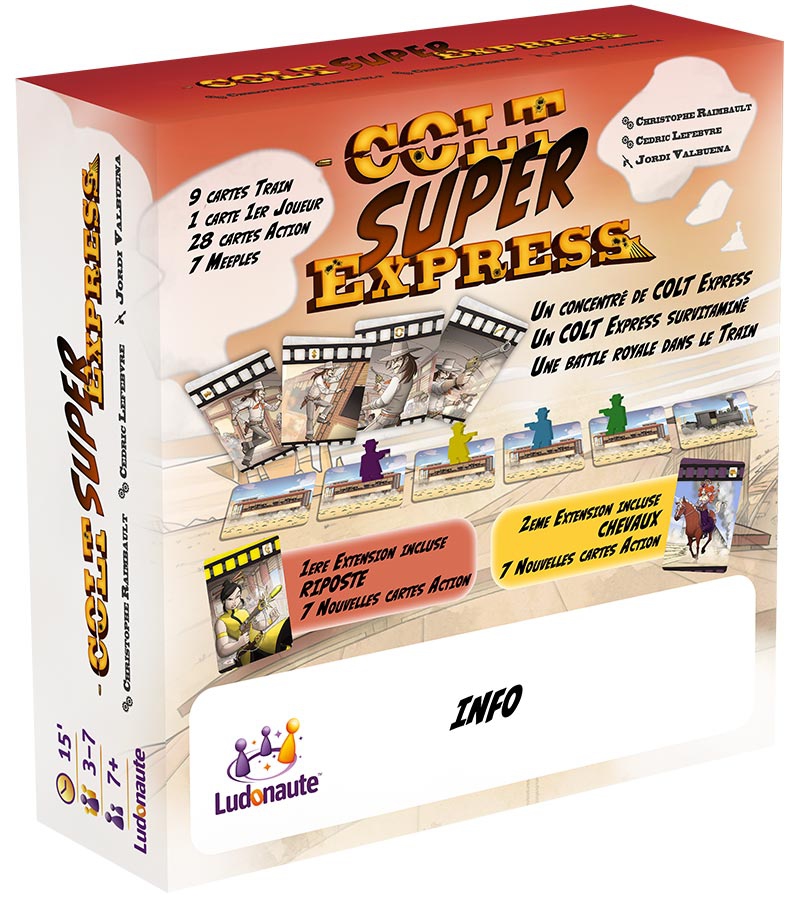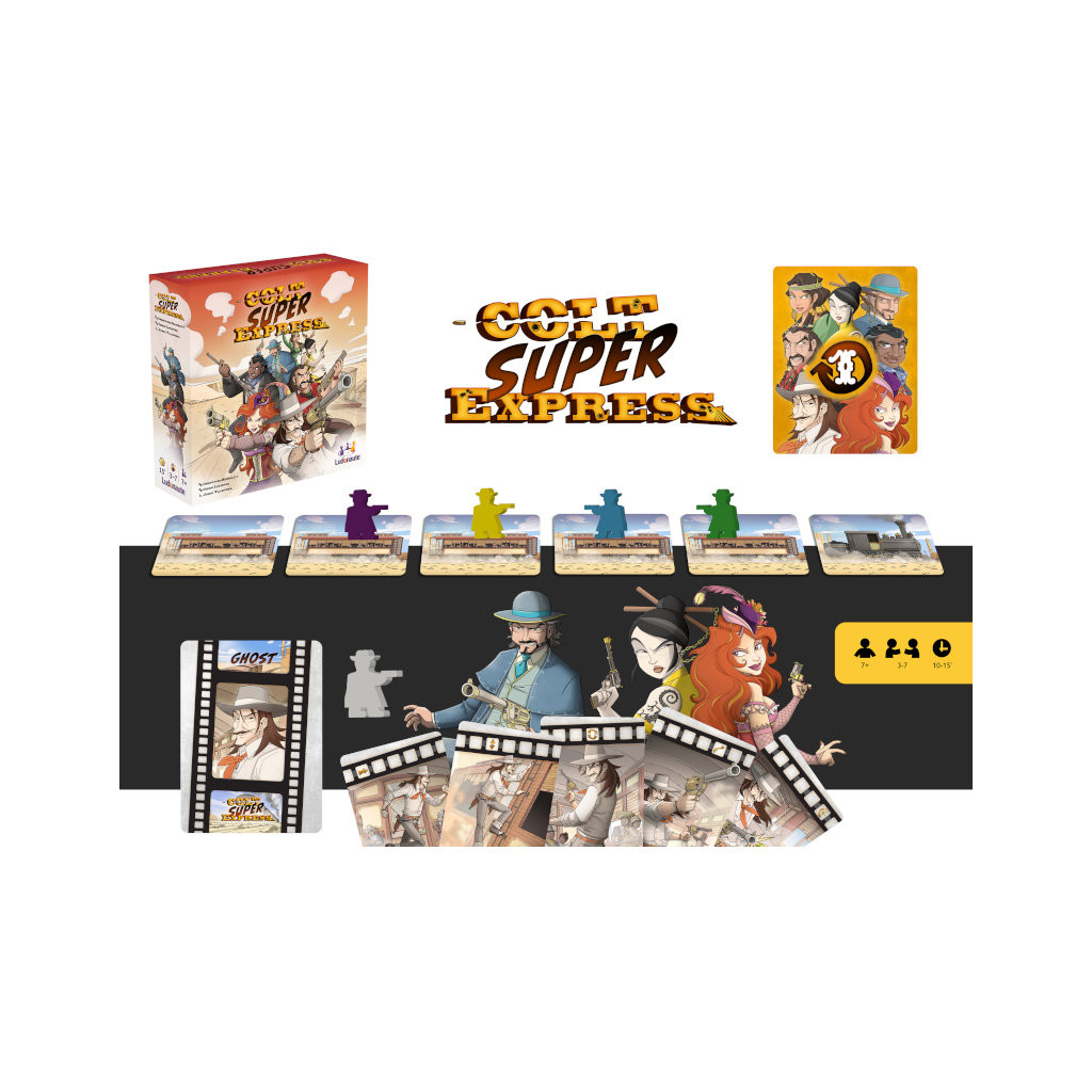Vous avez aimé Colt Express ? Vous allez adorer Colt Super Express ! Ce concentré est encore plus fun et plus dynamique. Le but n’est plus de finir le plus riche mais de finir tout court ! Soyez le dernier dans le train pour remporter la partie mais attention aux explosifs qui réduisent le nombre de wagons et aux tirs affûtés des autres Bandits.