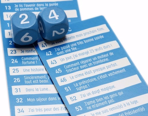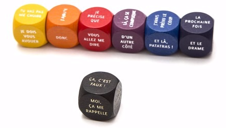 Contenu : 6 dés colorés avec des mots de transition sur chacune des faces, tels que Je dois vous avouer / Mais / Tout à coup / D’un autre côté / J’avais prévu le coup / C’est comme ça que .