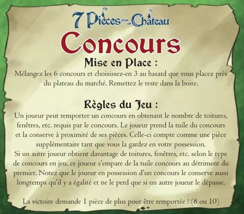 7 Pièces pour un Château – Extension Concours est une extension qui ajoute 6 concours au jeu de base ! Une course aux objectifs qui pimente bien le jeu, et toujours… qui aura le plus beau château ?