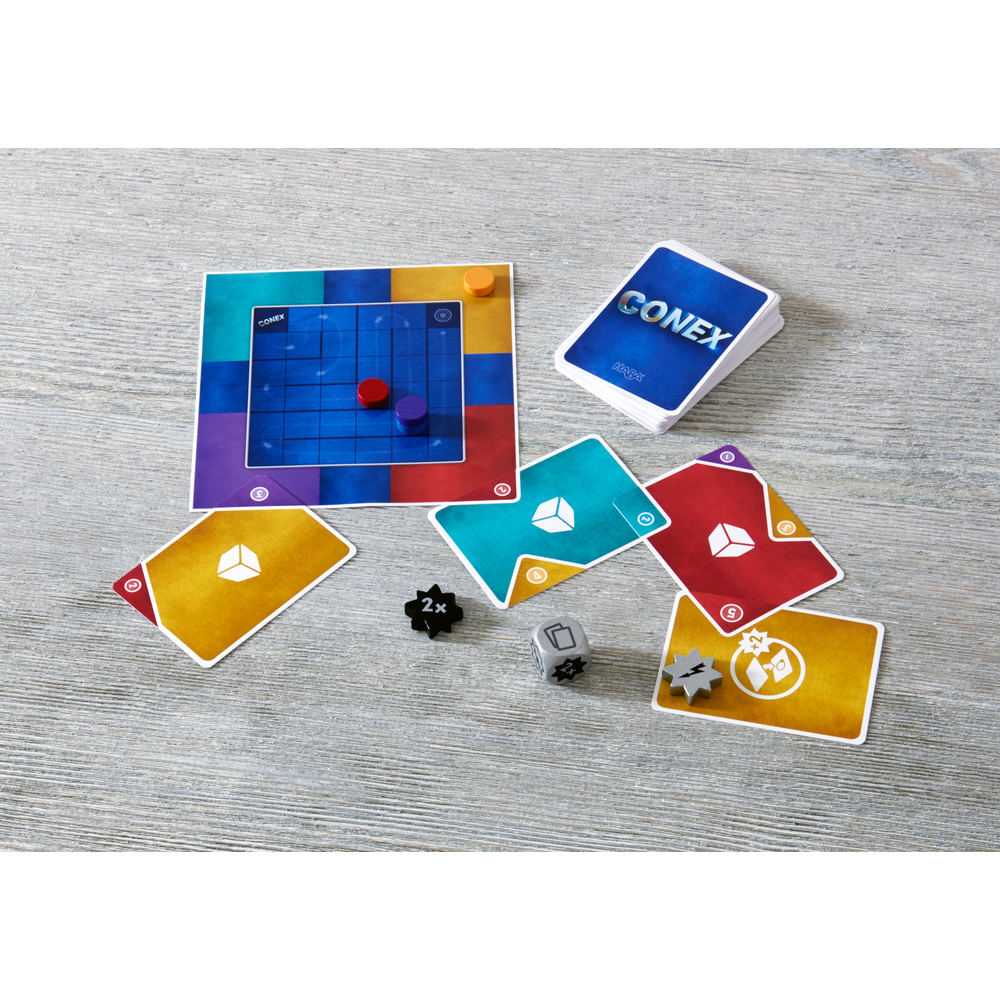 Les joueurs cherchent les meilleurs emplacements où poser leurs cartes aux coins CONEX de grande valeur. Attention : à ce jeu, l’acuité visuelle est mise à rude épreuve ! En plus, il faut utiliser les étoiles d’action obtenues avec le dé en fin stratège, mais sans tarder ! Gardez une vue d’ensemble et devenez maître CONEX.