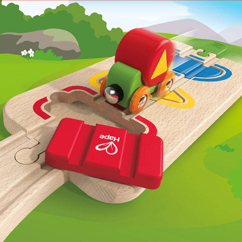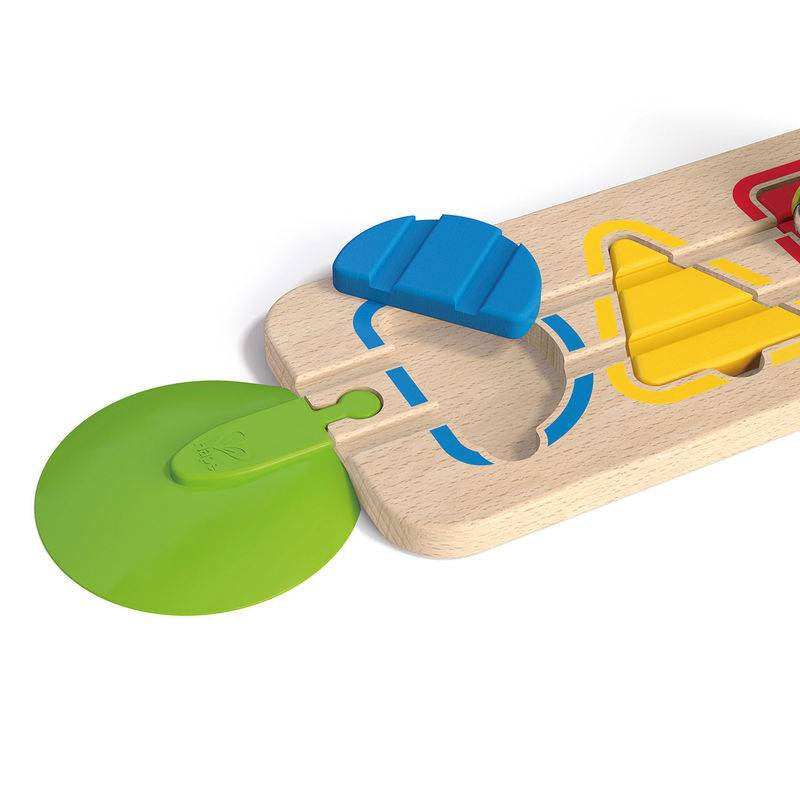 Le train ne peut pas traverser les voies avant que tu ne places correctement les couleurs et les formes ! Trie et dispose les pièces adéquates en bois pour que le train puisse avancer tranquillement.