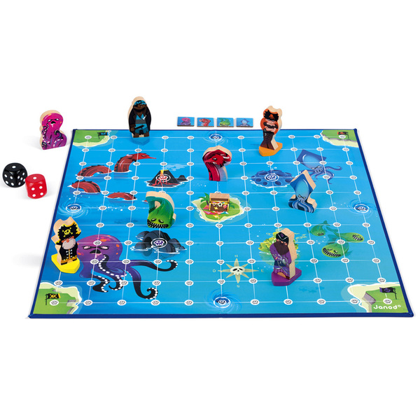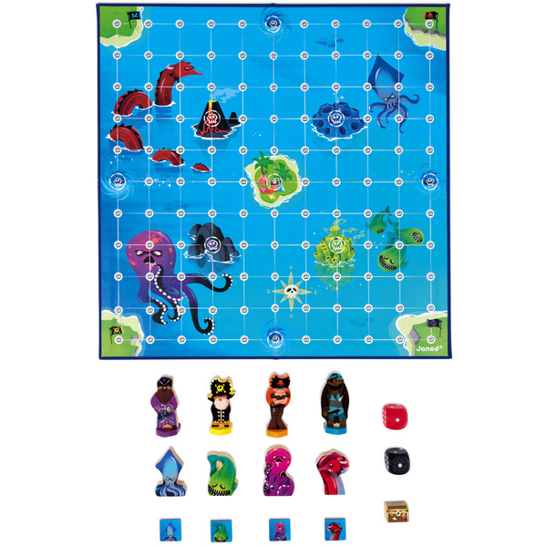 Contenu : Un plateau de jeu en carton, 9 pions en bois : 4 Bateaux pirates, 4 Monstres, 1 trésor, 2 dés.