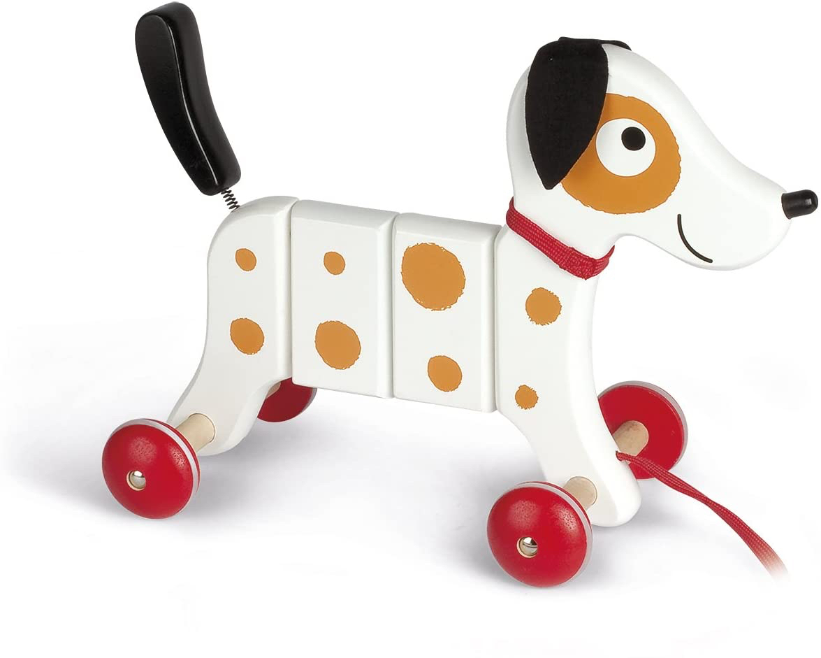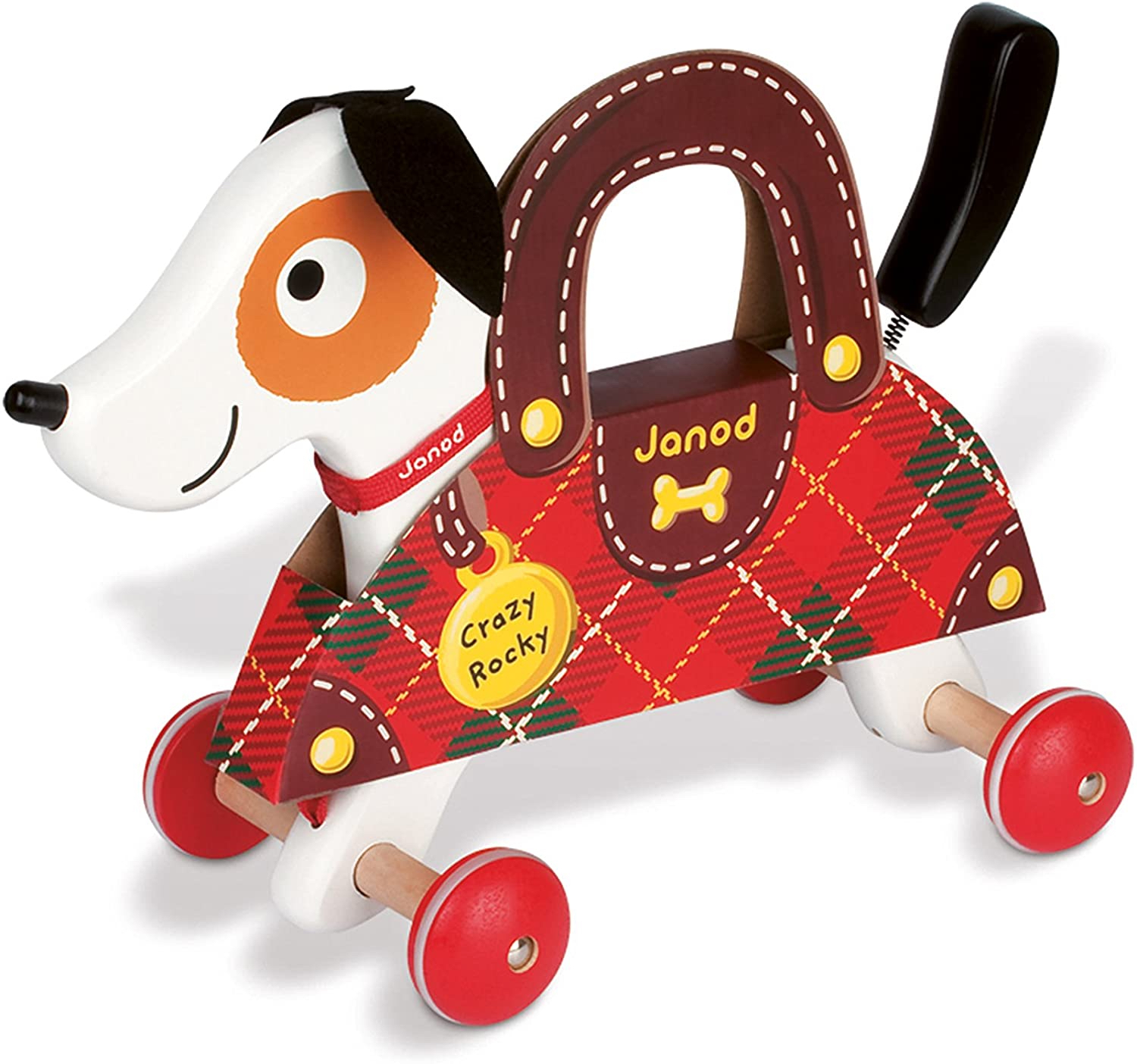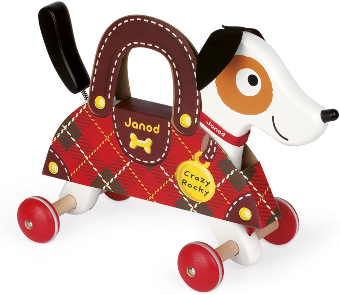 Chien articulé à promener Crazy Rocky de Janod. Un magnifique jouet d’éveil que votre enfant emmènera partout grâce à sa laisse en tissu. Sa queue bouge lorsqu’on le promène, grâce à un système à ressorts. Pendant la balade, l’animal se dandine et sa clochette tinte joyeusement ! Ce jouet rigolo à tirer et à promener partout servira également de décoration dans la chambre de votre enfant.