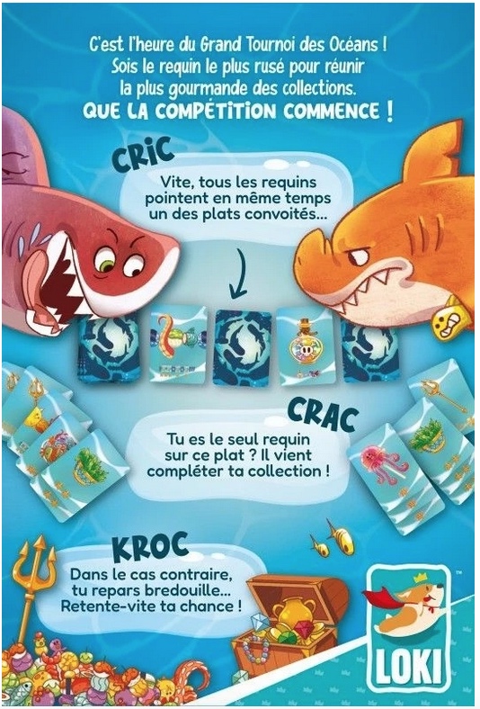 Cric Crac Kroc… est un jeu de cartes rapide, dans lequel vous devrez récupérer des plats mais attention, car vous ne serez pas le seul requin à convoiter ce délicieux repas !