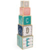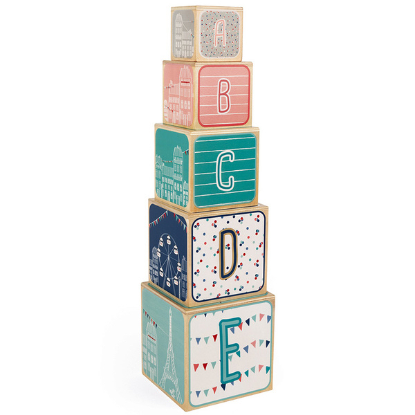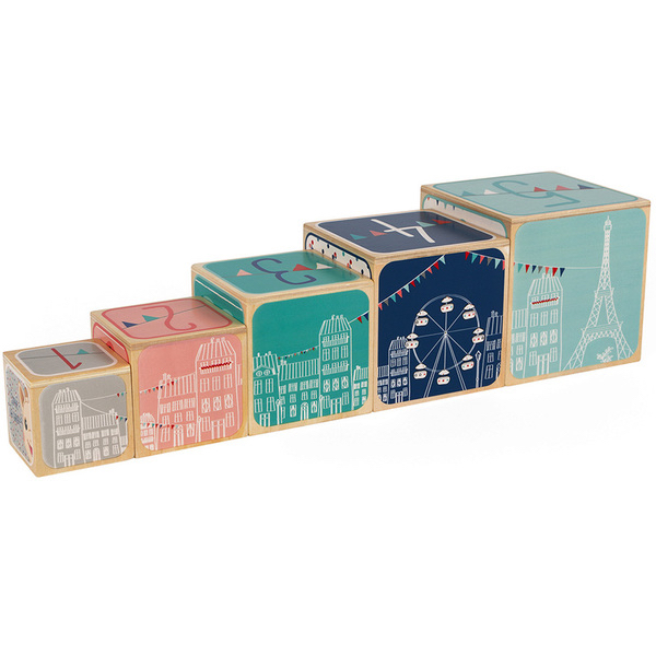 Contenu : 5 cubes encastrables en bois. Impression par transfert à chaud.