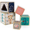 Chaque face du cube est illustrée sur un thème différent : Sophie la girafe et ses amis, chiffres, lettres, un paysage parisien à reconstituer… Chaque cube possède également une face ajourée avec une forme reconnaissable (cœur, étoile, triangle…) qui laissera apparaître l’illustration du cube encastré.
