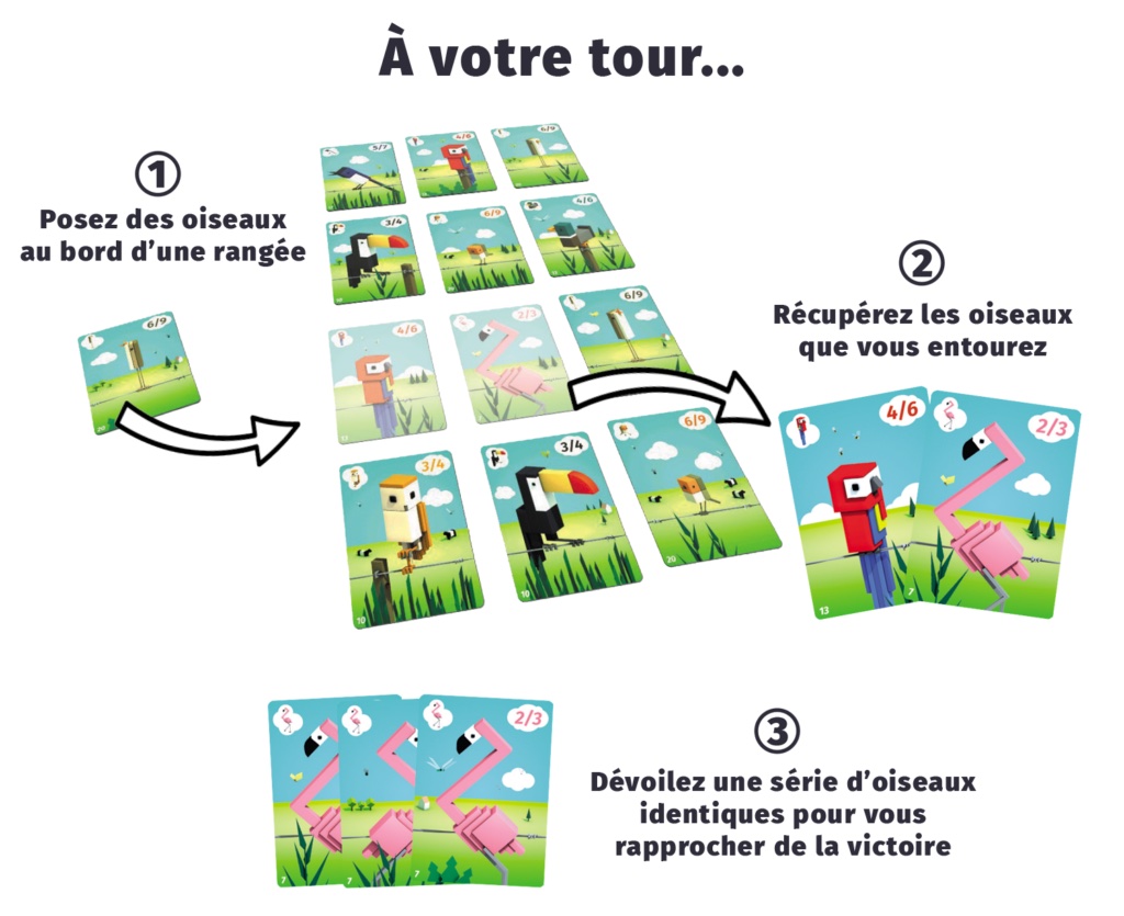 Votre but ultime est d’être le premier joueur à rassembler dans votre zone de score soit sept espèces différentes, ou deux espèces avec au moins trois oiseaux identiques dans chacune. Chaque oiseau vient avec un petit et un grand nombre de troupeaux, donc vous pouvez attendre d’atteindre un grand troupeau pour ajouter plus d’oiseaux à la fois à votre zone de notation. Méfiez-vous, cependant, car le tour se termine dès qu’un joueur vide sa main, forçant tous les joueurs à se défausser de leurs mains et de leurs plans actuels !