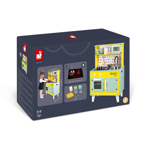 Parfaitement équipée avec une horloge avec aiguilles fonctionnelles, une patère pour suspendre les cuillères, un évier en métal, une ardoise, elle a aussi en bonus des plaques à induction qui s’allument grâce à des leds et qui imitent le bruit de l’eau qui boue ! Il suffit d’appuyer une fois sur les boutons rouges pour que les plaques s’allument, puis une deuxième fois pour entendre le son de l’eau qui bout. Le son et les plaques à induction s’éteignent automatiquement au bout de 30 secondes ou lorsqu’on appuie une troisième fois sur les boutons rouges. Comme une véritable cuisine, elle est équipée de 3 boutons rotatifs (dont deux avec bruitage), d’un four, d’un micro-ondes et d’un placard avec portes magnétiques. Pour compléter cette cuisine pour enfant en bois, 7 accessoires sont inclus : 1 poêle en métal, 1 passoire en métal, 1 cuillère en métal, 1 manique et 3 boites d’aliments en carton.