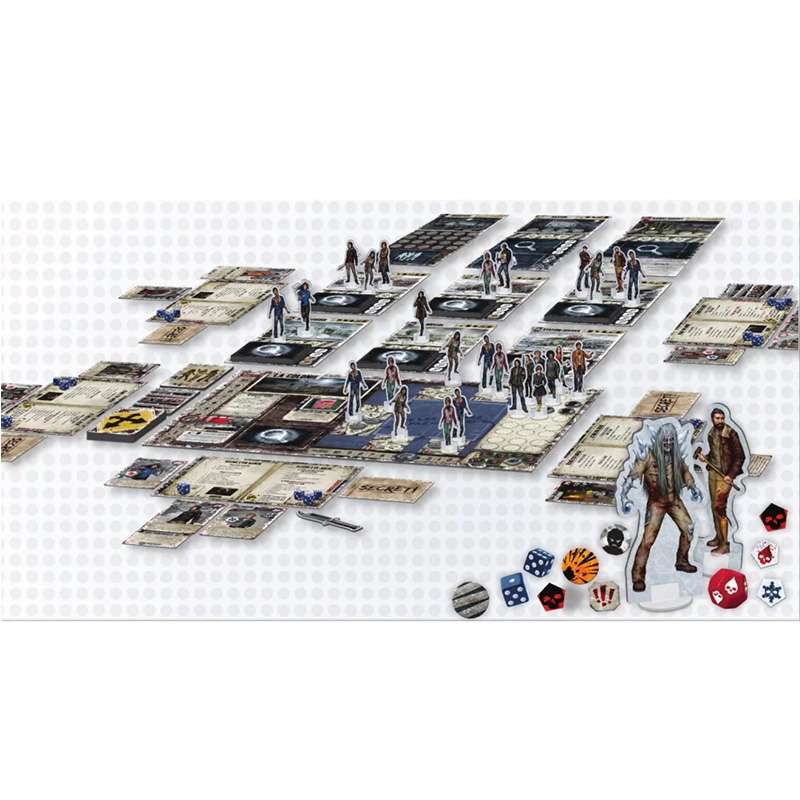 Contenu du jeu : 353 cartes, 107 jetons, 20 survivants cartonnés, 30 zombies cartonnés, 20 bandits cartonnés, 19 expériences Raxxon cartonnées, 2 marqueurs, 25 jetons Blessure, 9 plateaux Lieu, 5 plateaux Joueur, 1 plateau de la colonie, 100 socles en plastique, 30 dés d’action, 1 dé de risque, 1 règle de jeu.