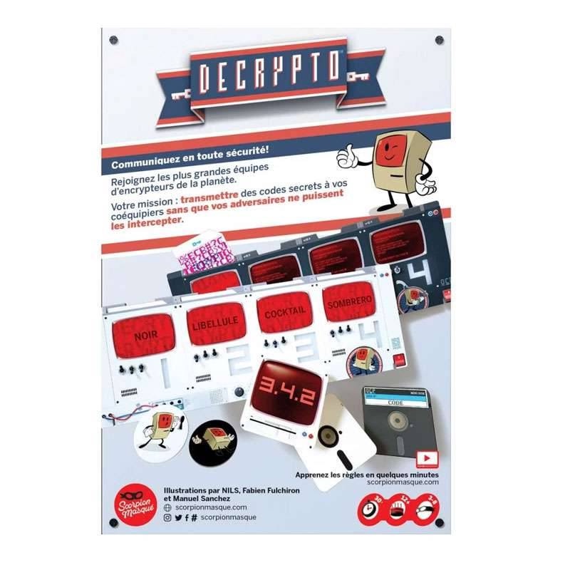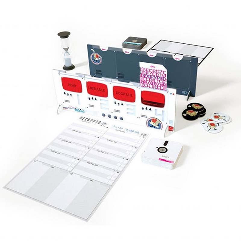 Contenu : 1 sablier, 2 écrans, 8 jetons, 110 cartes Mots-clefs soit 440 mots, 48 cartes Code, 1 livret de règle.
