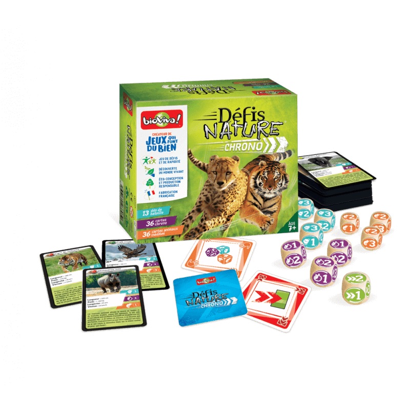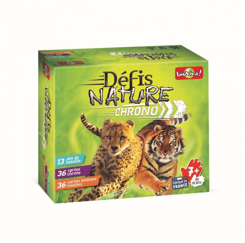 Soyez le plus rapide pour l’emporter dans l’épreuve « Chrono », puis défiez les autres joueurs grâce aux nouveaux dés de force, vitesse et camouflage. Saurez-vous mener vos animaux à la victoire et tenir le rythme de Défis Nature Chrono ? Le + produit : un nouveau format de boîte, facile à emporter partout.