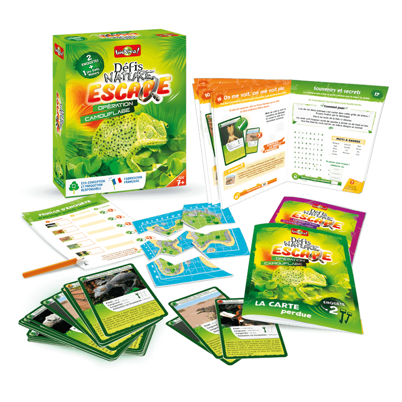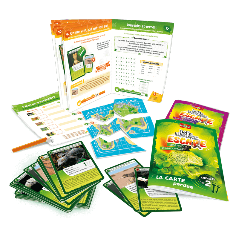 Défis Nature Escape – Opération Camouflage regroupe 2 enquêtes et un jeu Défis Nature.