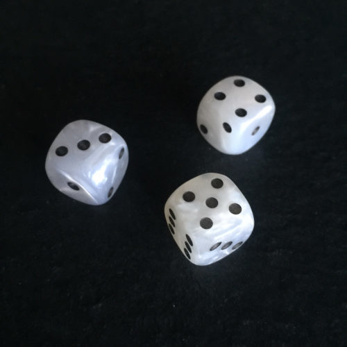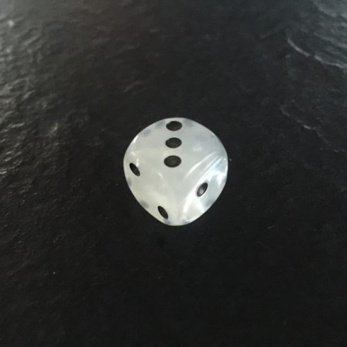 Dés à jouer nacrés /marbrés Blanc avec coins arrondis et marquage sur les faces du dé. Taille standard de 16 mm avec marquage habituel. Un joli dé aux couleurs nacrées avec des reflets à l’intérieur du cube. Accessoires pour jeu de rôle, jeu de société ou de stratégie. Vente à l’unité.