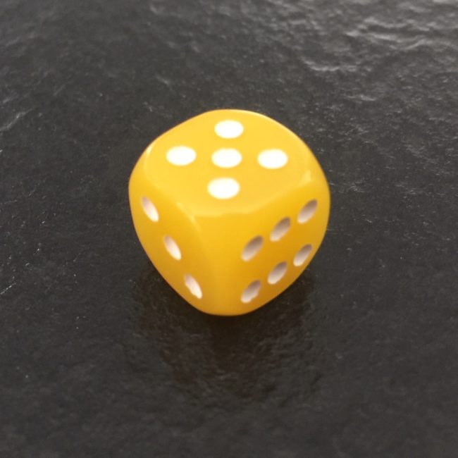 Dés à jouer opaque Jaune avec coins arrondis et marquage en creux sur les faces du Dé. Taille standard de 16 mm. 10 couleurs au choix. Accessoires pour jeu de magie, de rôle, jeu de société ou de stratégie. Vente à l’unité.