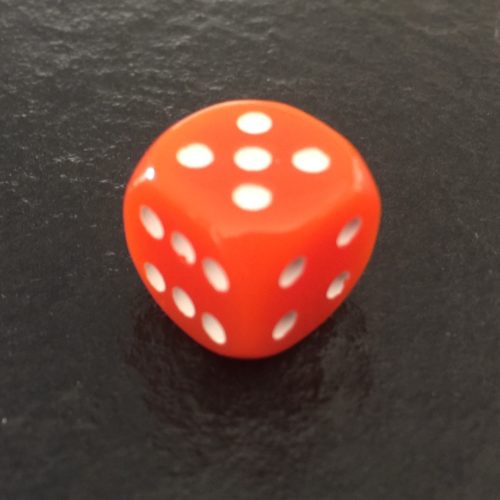 Dés à jouer opaque Orange avec coins arrondis et marquage en creux sur les faces du Dé. Taille standard de 16 mm. 10 couleurs au choix. Accessoires pour jeu de magie, de rôle, jeu de société ou de stratégie. Vente à l’unité.