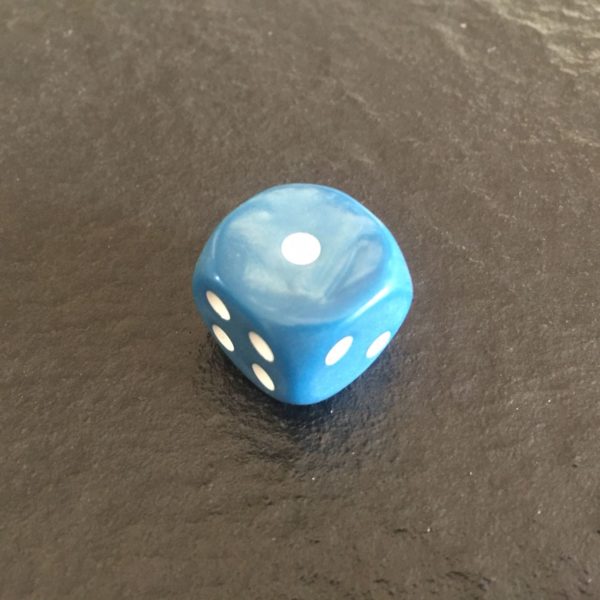 Dés à jouer nacrés /marbrés Bleu avec coins arrondis et marquage sur les faces du dé. Taille standard de 20 mm avec marquage habituel. Un joli dé aux couleurs nacrées avec des reflets à l’intérieur du cube. Accessoires pour jeu de rôle, jeu de société ou de stratégie. Vente à l’unité.