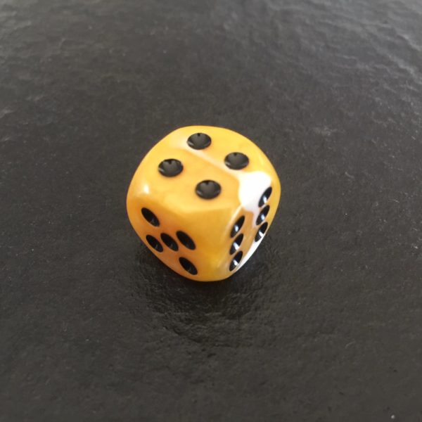 Dés à jouer nacrés /marbrés Jaune Foncé avec coins arrondis et marquage sur les faces du dé. Taille standard de 20 mm avec marquage habituel. Un joli dé aux couleurs nacrées avec des reflets à l’intérieur du cube. Accessoires pour jeu de rôle, jeu de société ou de stratégie. Vente à l’unité.