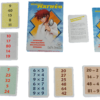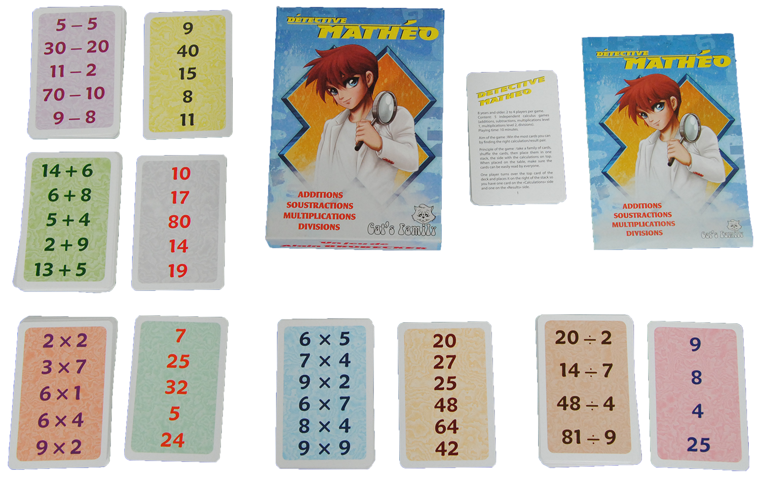 Le jeu contient : 110 cartes. 21 cartes Multiplications niveau 1, 30 cartes Multiplications niveau 2, 21 cartes Additions, 21 cartes Soustractions, 13 cartes Divisions, 4 cartes Règles des jeux anglais et allemand et le livret de règles en français.