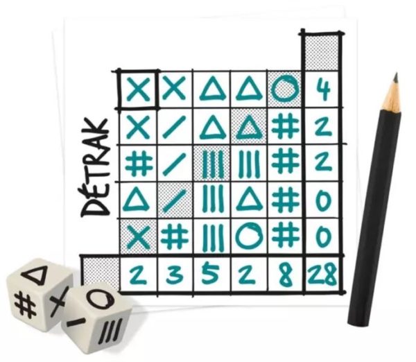 Détrak… Lancez les dés et notez les symboles obtenus dans votre grille pour marquer le plus possible de points. Le hasard des dés ne fera pas les bons choix à votre place ! Un jeu sans temps mort en simultané.