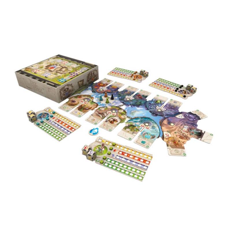 Contenu : 1 plateau Temple avec étui,1 plateau Îles,96 cartes, 1 jeton compte-tours, 8 dés aux faces amovibles, 108 faces de dé, 4 inventaires de Héros, 4 pions héros, 20 cubes de couleur, 4 extensions de réserve, 20 jetons, 1 jeton Premier joueur, 1 aide.
