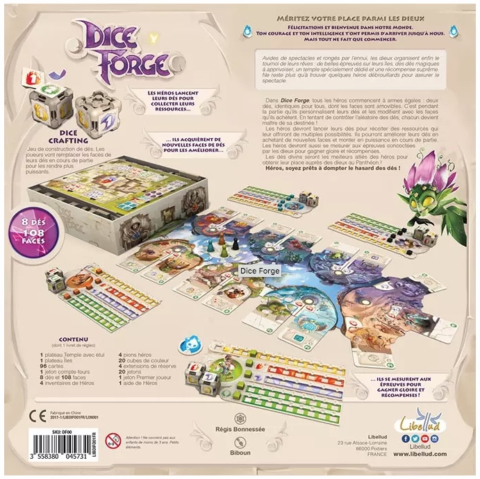 Dice Forge est un jeu de développement doté d’un matériel innovant : des dés aux faces amovibles. Dans ce jeu de dice crafting vous construisez vous-même votre dé. Lancez vos dés, gérez vos ressources, réalisez les épreuves avant vos adversaires et explorez les multiples stratégies pour remporter la victoire.