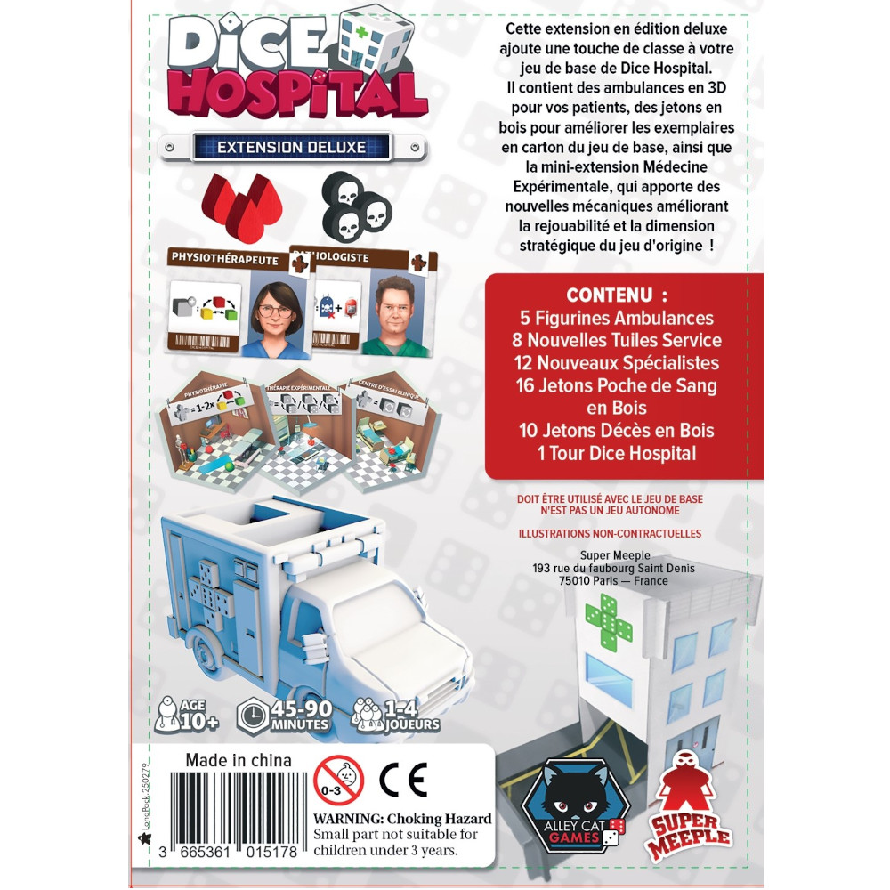 Cette édition en édition deluxe ajoute une touche de classe à votre jeu de base de Dice Hospital. Il contient des ambulances en 3D pour vos patients, des jetons en bois pour améliorer les exemplaires en carton du jeu de base, ainsi que la mini-extension Médecine Expérimentale, qui apporte des nouvelles mécaniques améliorant la rejouabilité et la dimension stratégique du jeu d’origine !