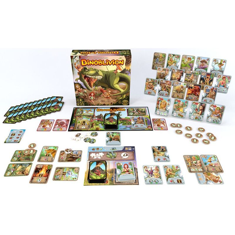 Dinoblivion, un jeu de Deck-building, Tableau-building et de gestion de ressources. Dirigez votre tribu primitive et dominez la terre des Dino. Dès 12 ans.