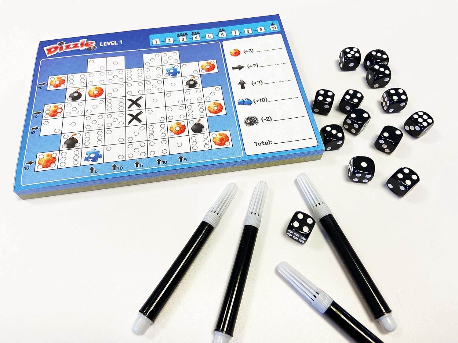 Contenu : 1 Bloc avec 4 niveaux. 13 Dés. 4 Feutres. 1 Livret de règles.
