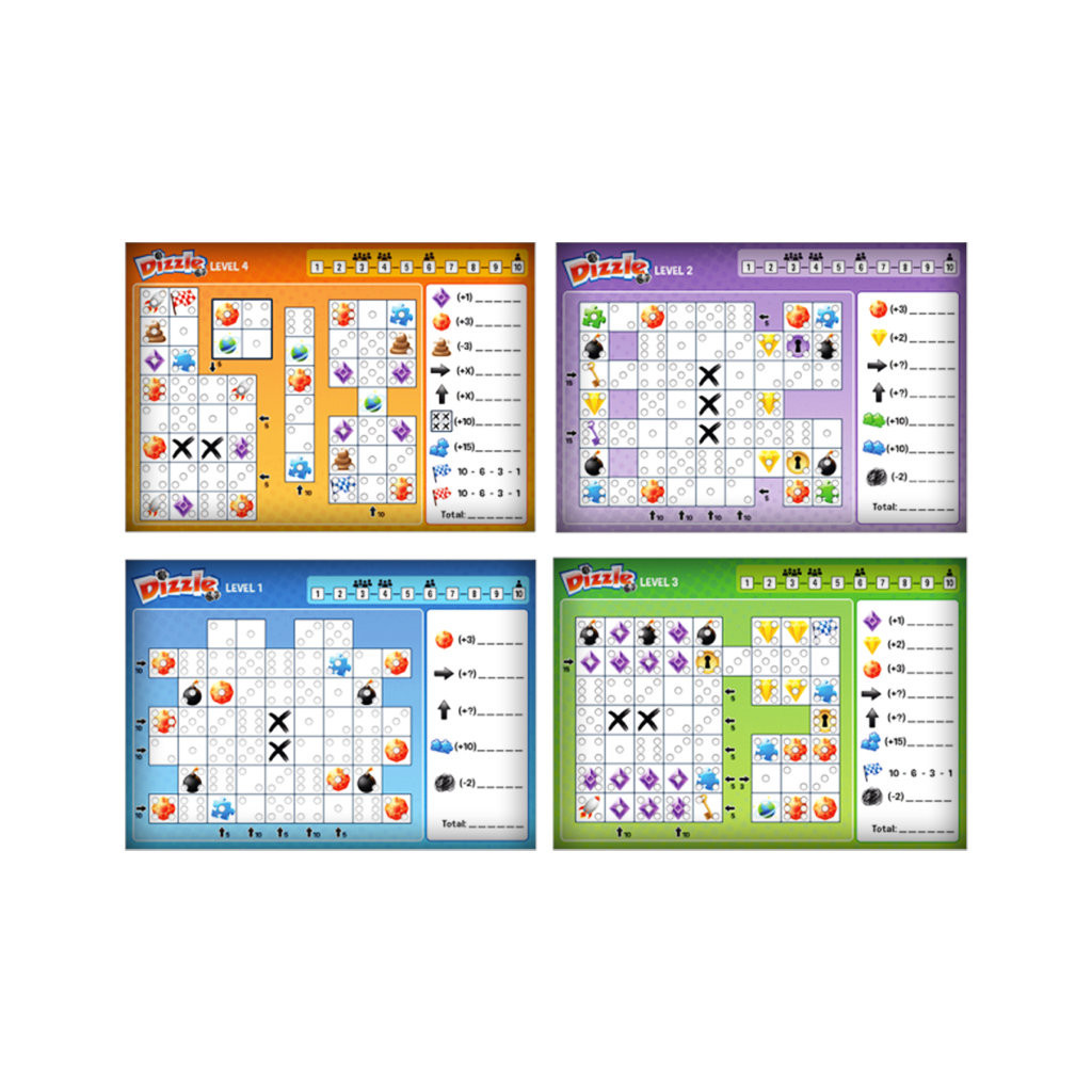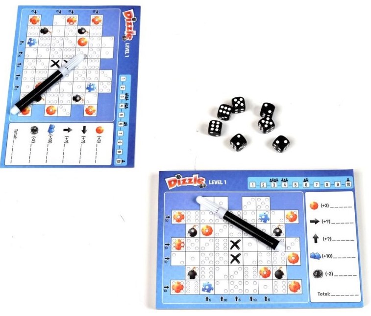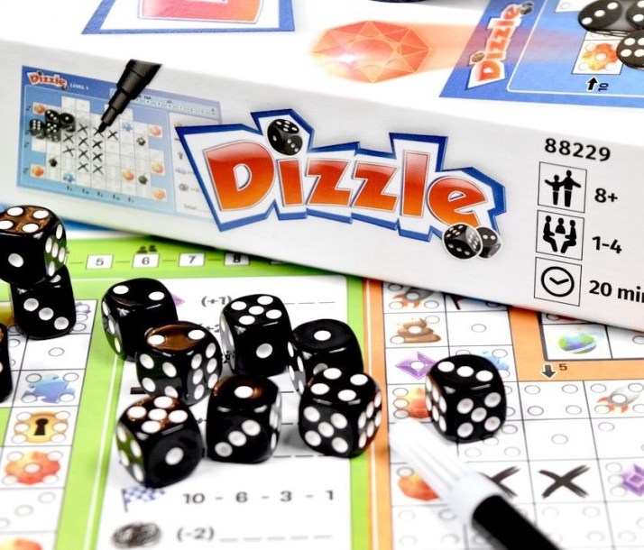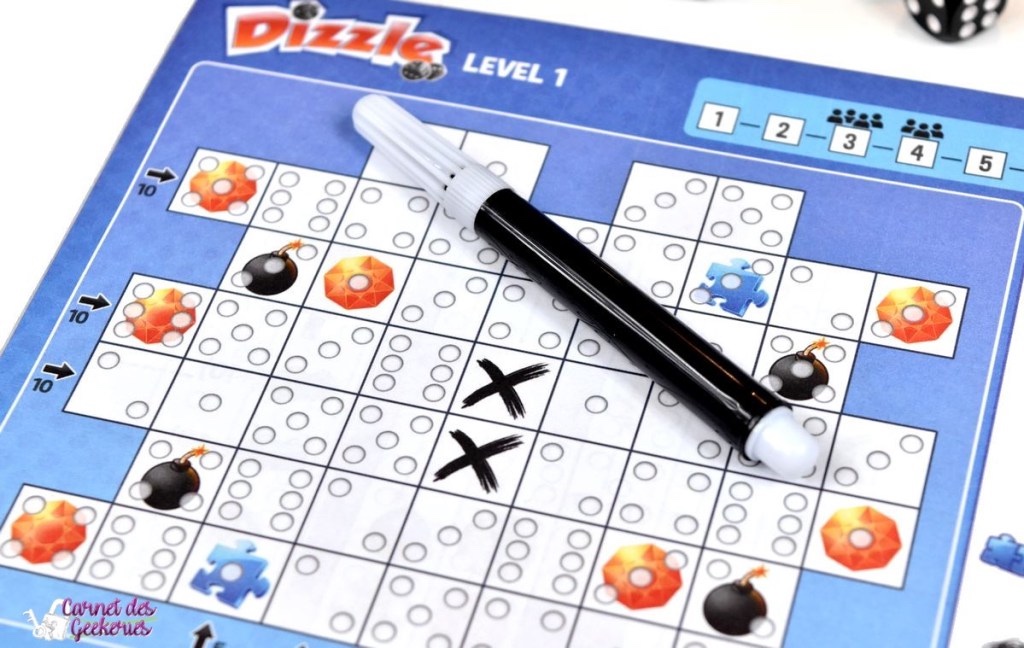 À la fin d’un tour, cochez toutes les cases recouvertes de dés. Cela peut paraître simple, bien sûr, mais vos adversaires risquent de lorgner sur les dés dont vous avez besoin… Dizzle est rapide, simple, efficace et casse-tête comme on aime ! Il propose 4 niveaux à difficulté progressive.
