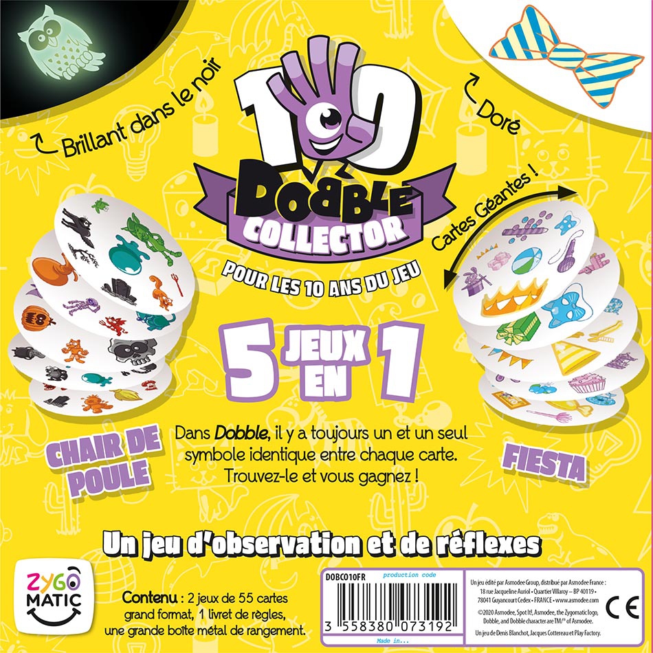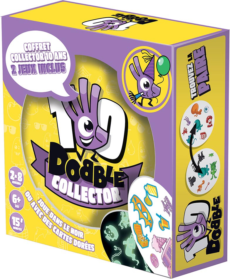 Dobble, fête son 10ème anniversaire ! L’incontournable jeu d’ambiance vendu à travers le monde nous offre 2 sets dans une seule boite géante ! Avec des cartes qui brillent dans le noir et d’autres très luxueuses. Un futur Collector.